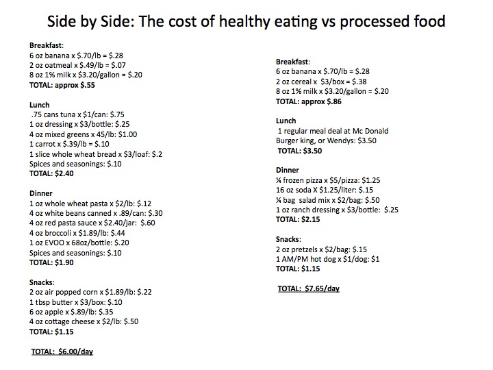 I’ve included a JPEG of my PPT file so you can see the comparison, but basically I have the healthy day totalling $6/day for 3 meals and 2 snacks while the refined meal day costs $7.65 for 3 meals and 2 snacks.