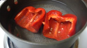 Blanch 1 large red bell pepper in boiling water for about 30 seconds