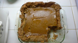 Blend the pumpkin and milk in a blender or food processor.  Whisk eggs and add to pumpkin/milk combo.   Add almond butter and whisk.  Add sugar and spices and salt.  Whisk until smooth (it’s a lot of whisking, really).  Set aside