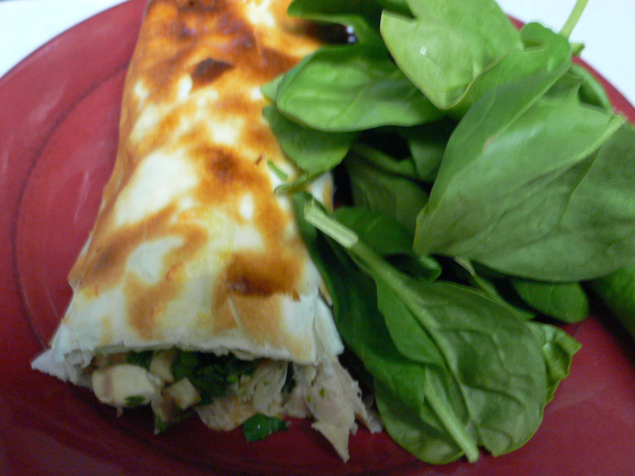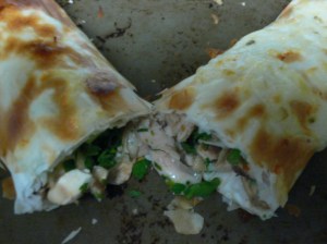 The resulting creating was a delicious, crispy yet light chicken and veggie burrito. I spread out my 7 layers of phyllo (still stacked). Next I took the left-over chicken from the previous night’s dinner and cut it into 1″ pieces and lay it length-wise along the midline of the phyllo. Then, thanks to the creativity of the huz, I added chopped green onions, mushrooms, and the left-over parsley from the week’s cooking class. Finally, a bit of pepper jack cheese and it was time to roll it up. I rolled so that it was like a long burrito and then lightly (and I do mean lightly) basted it with melted butter. To finish it off I dusted Matt’s end with some more pepper jack and placed it mid-over to bake for 6 minutes at 350. The secret to the success of this burrito was the 4 minutes of broiling to complete the masterpiece.